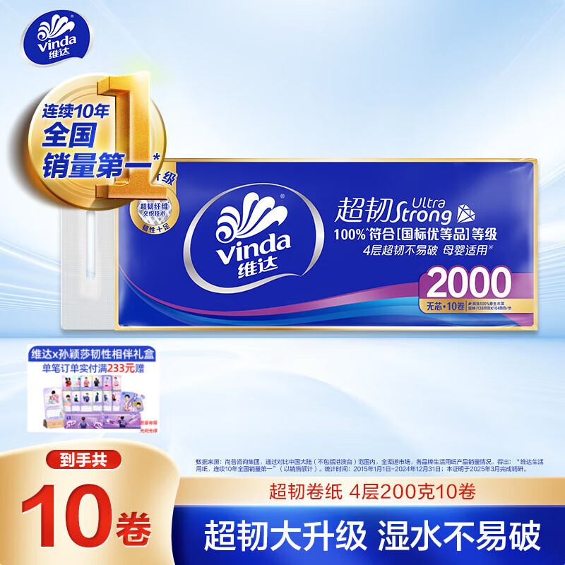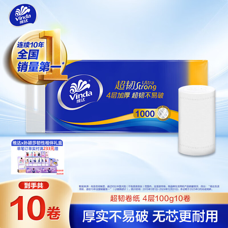 维达(Vinda)无芯卷纸 超韧4层80克*10卷 厚韧 卫生纸厕纸 卷筒纸巾 新旧混发